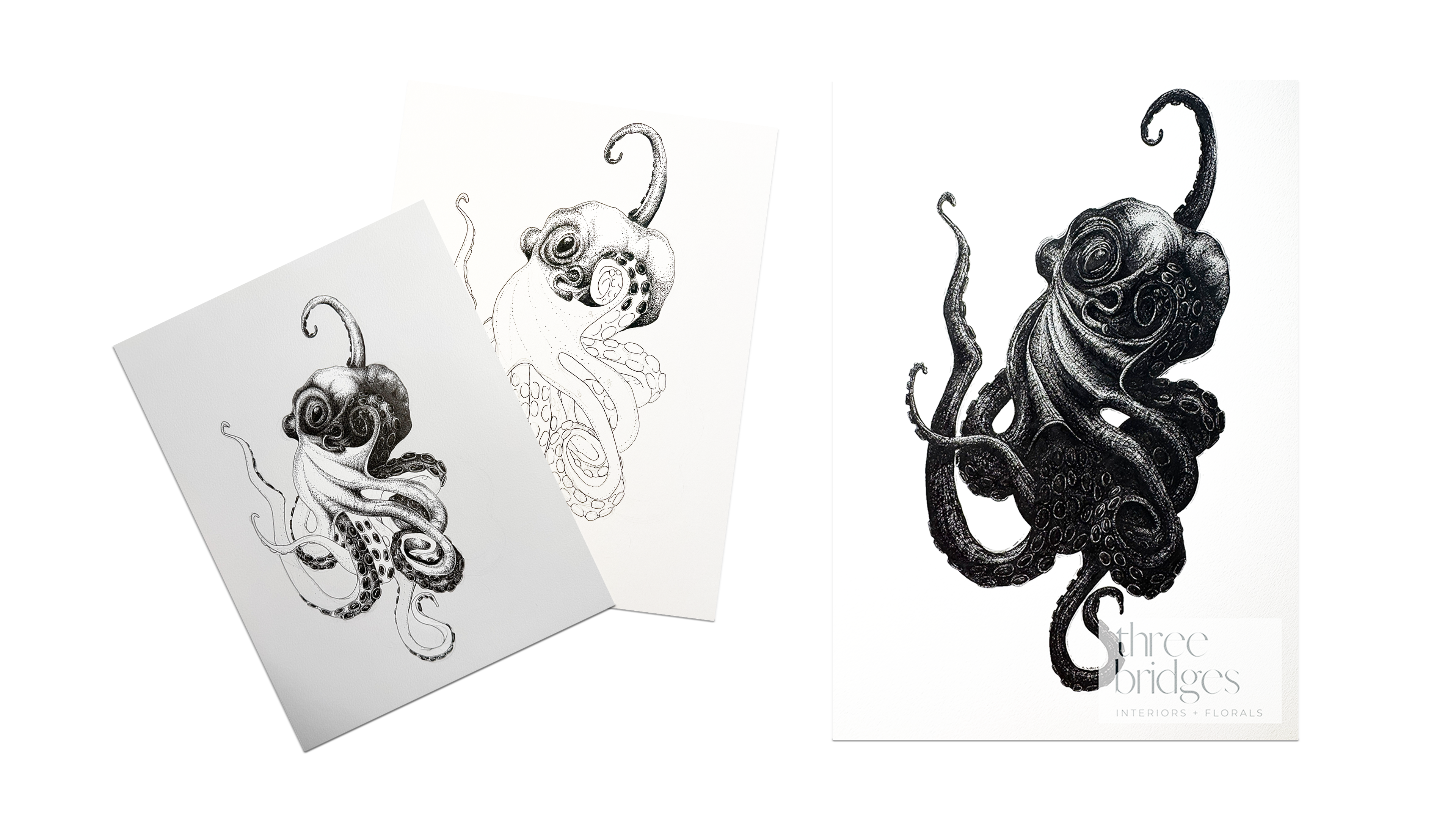 Custom pieces are the corner stone of Three Bridges, and often include architectural renderings, interior spaces, conceptual designs, illustrations, and even tattoo designs. Thoughtfully composed with attention to perspective, structure, fine detail, and tailored to your needs, these drawings are created to be both visually striking and deeply personal.