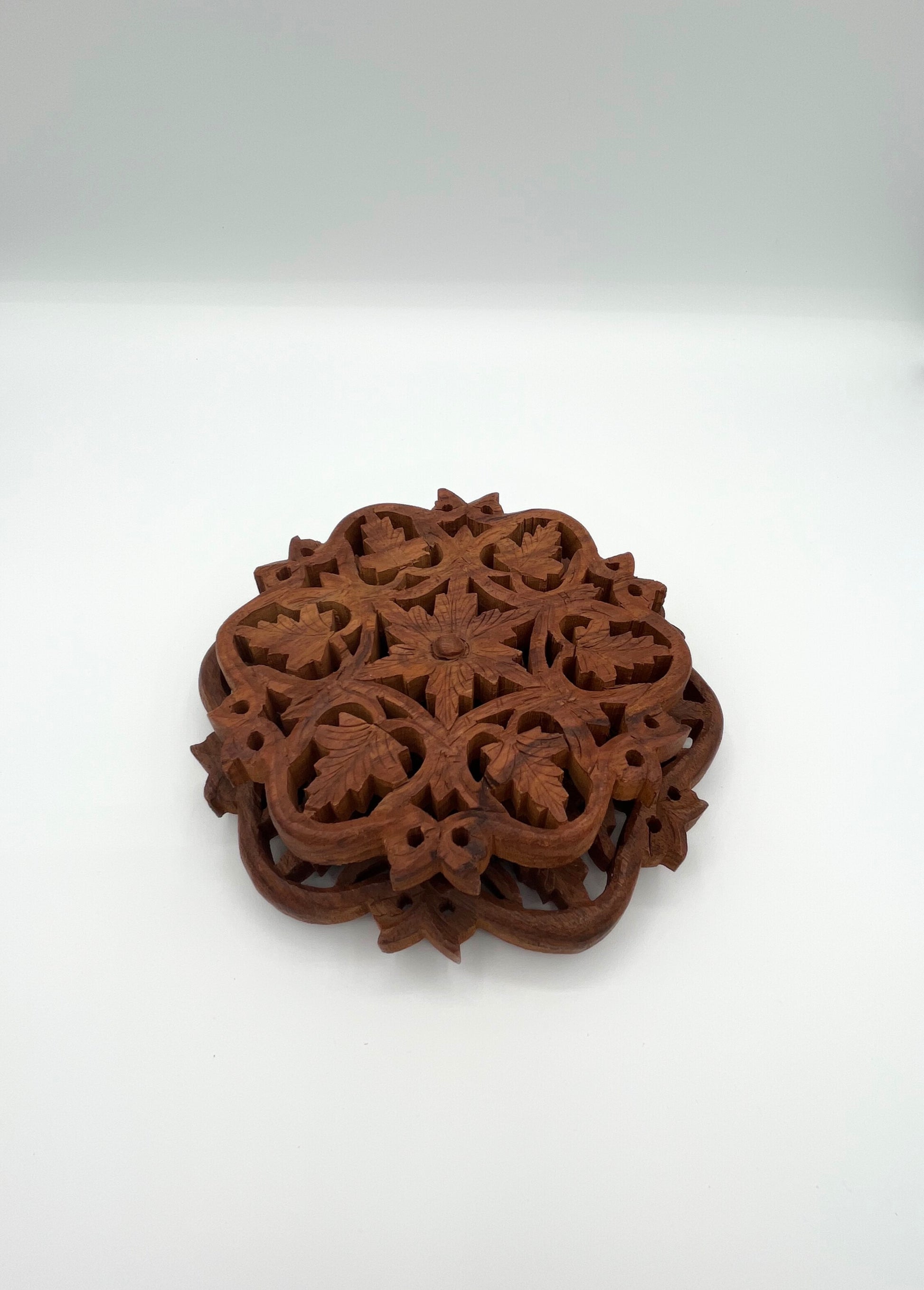 Set of 2 beautifully hand-carved vintage trivets. Made in India from teak wood these trivets will last ages, providing durability, natural antibacterial properties, style and function. Both trivets feature small wooden feet, ensuring stability while protecting surfaces from heat or scratches. Perfect for serving hot dishes, as a decorative accent, plant stands, candle holders, etc., the options are endless.