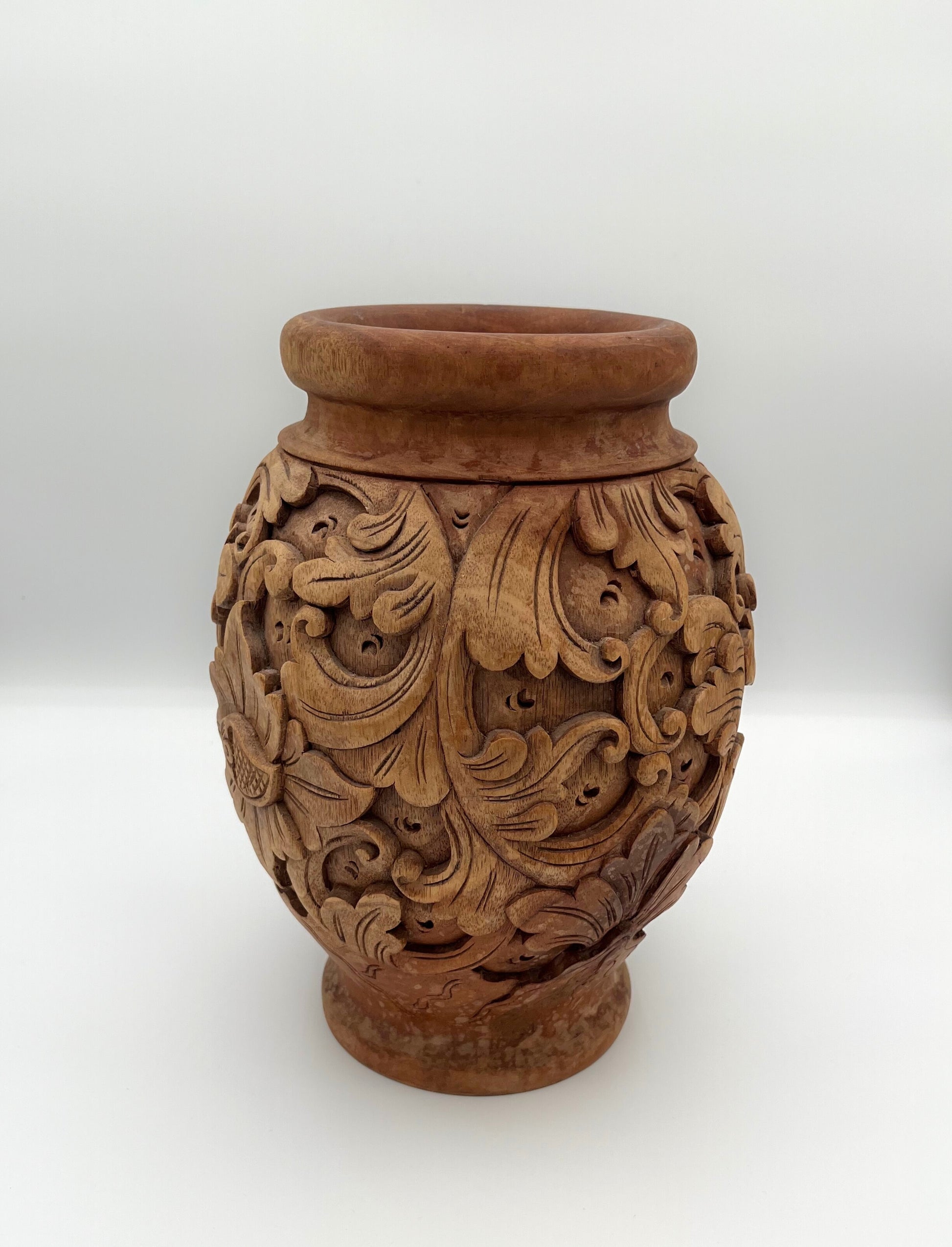 This rare, Balinese hand-carved vase is a unique, timeless piece with beautifully executed intricate patterns and details. This impressive piece is carved and hollowed from a single piece of wood, leaving no seams. The interior is not sealed, and is not waterproof- it would be best suited for holding dried flowers, grasses, or simply as a stand-lone piece of art. There are watermarks on the exterior, but we see it as added character and part of its previous story.